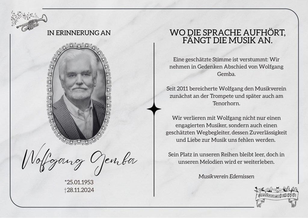 Der Musikverein trauert um Wolfgang Gemba. Teilen mit: Klicke, um auf X zu teilen (Wird in neuem Fenster geöffnet) X Klick, um auf Facebook zu teilen (Wird in neuem Fenster geöffnet) Facebook Gefällt mir Wird geladen …